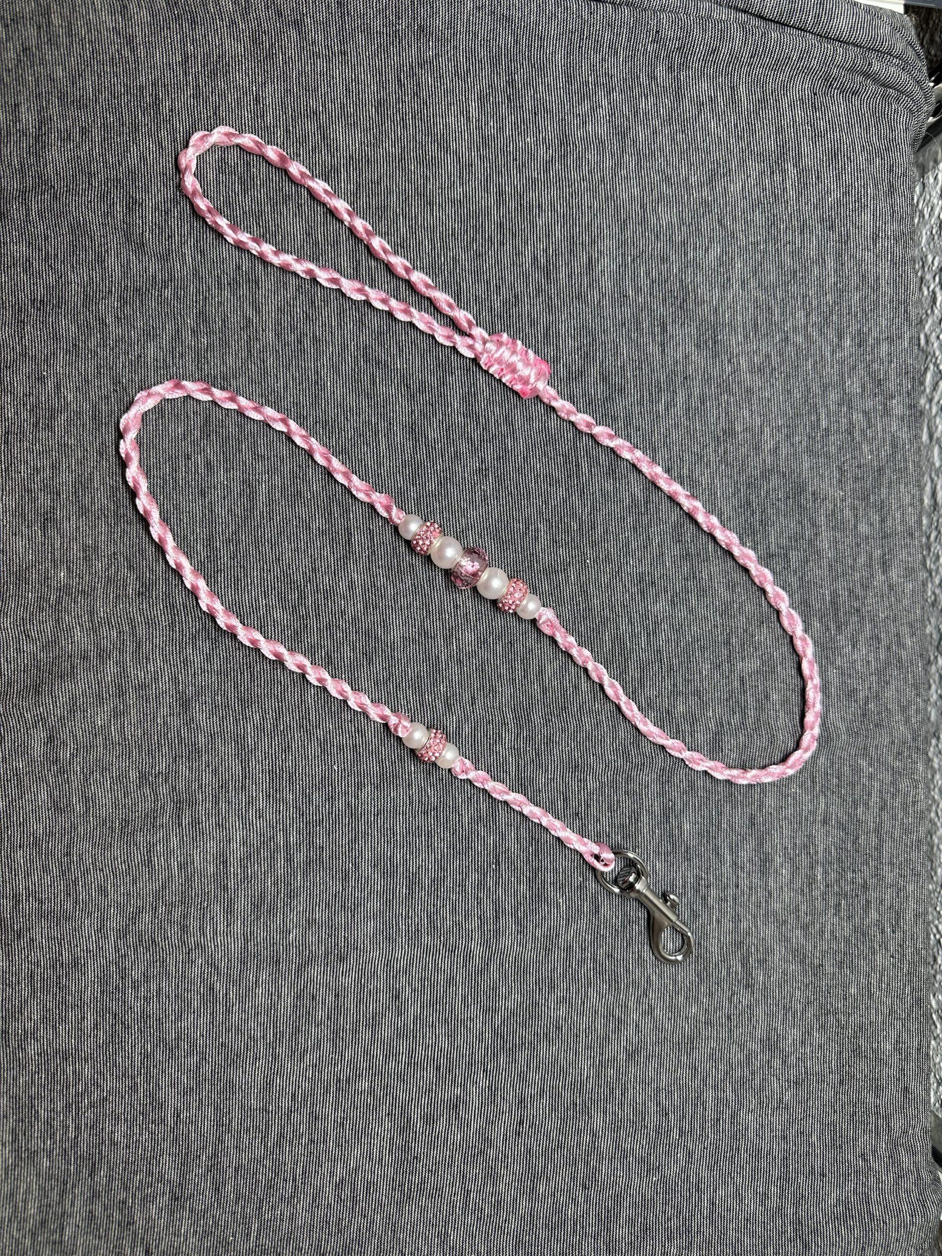 Rosa handflätat utställningskoppel med hake för mindre hundar.