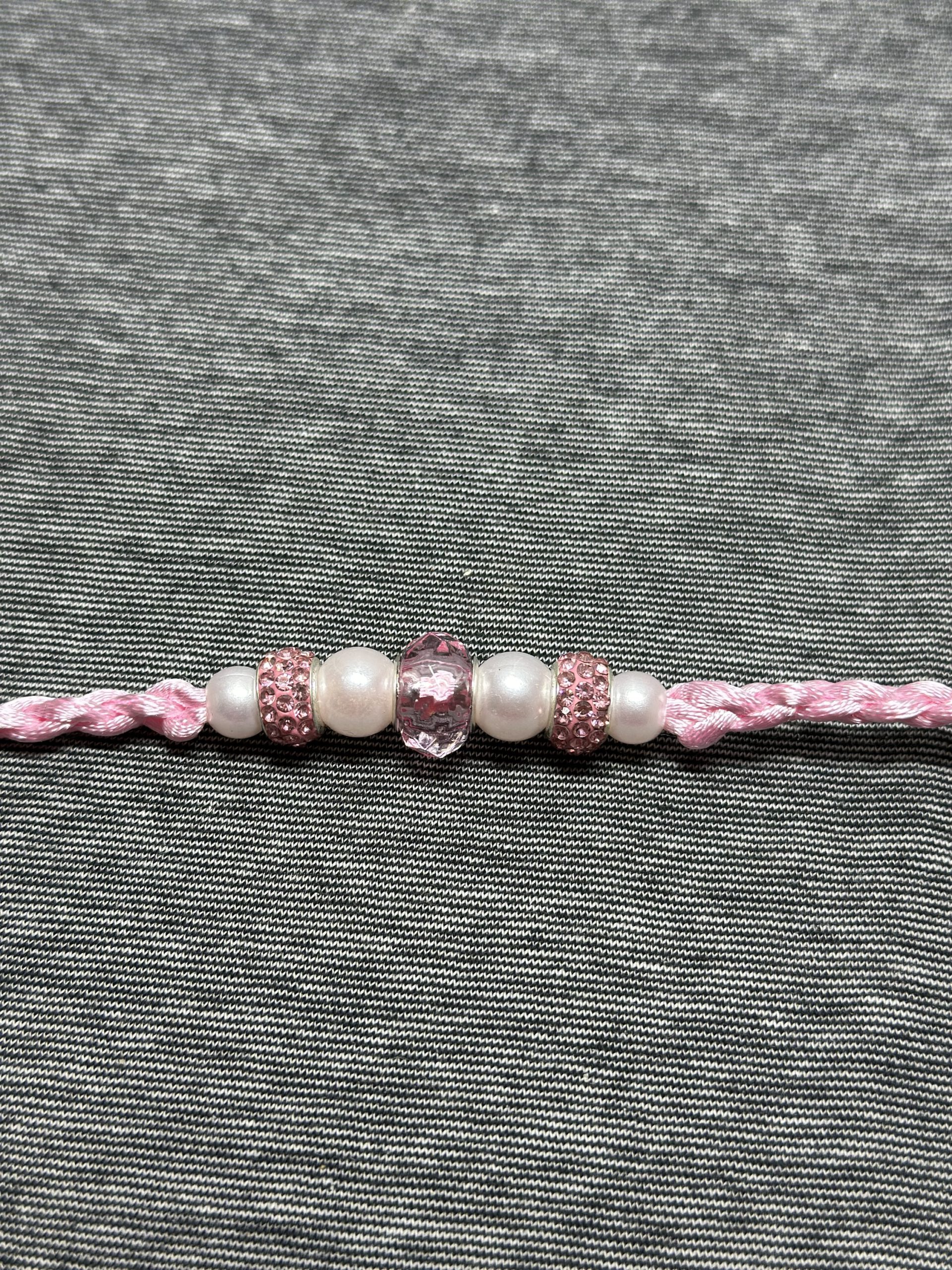 Kopplet är 4-flätat av rattail och är ca 5 mm tjockt med vackra pärlor för lite extra bling i ringen.
