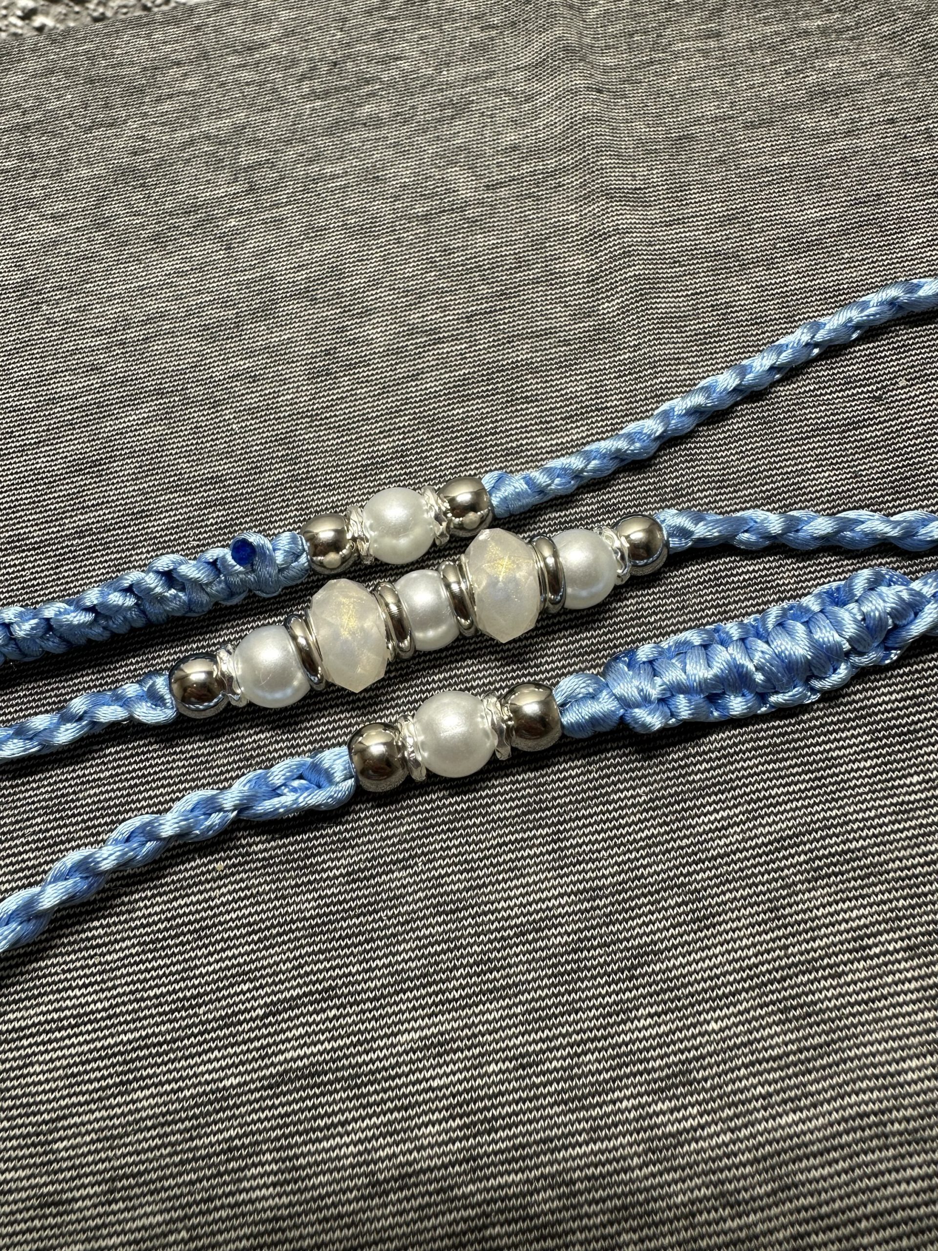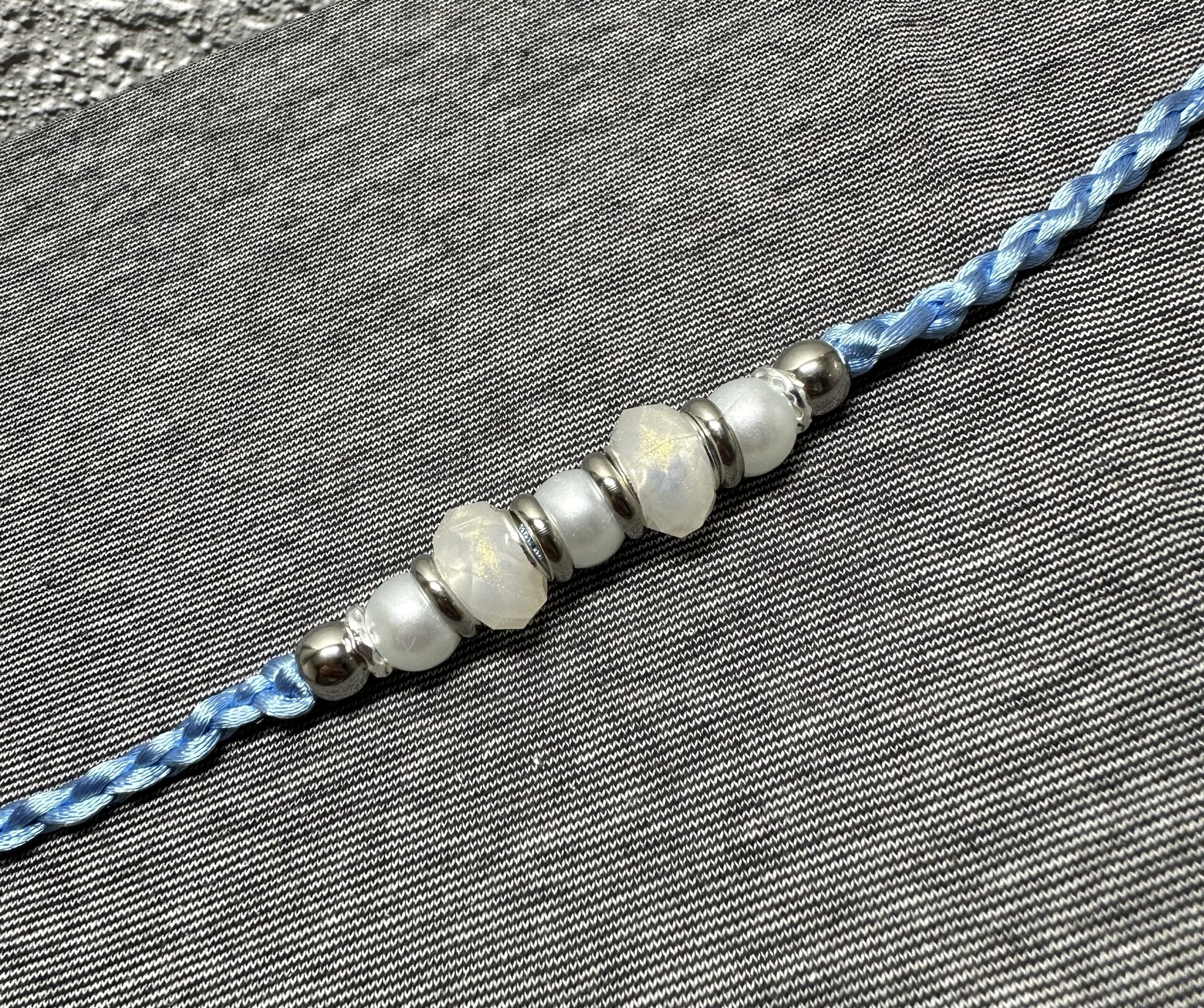 Kopplet är 4-flätat av rattail och är ca 5 mm tjockt med vackra pärlor för lite extra bling i ringen.